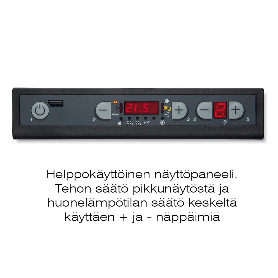 Helppokäyttöinen näyttöpaneeli ilmoittaa nykyisen takan mittaaman huonelämpötilan, ja lämpötilaa voidaan säätää helposti + ja – näppäimillä. Tehoalueella 1-5 voit säätää takan tuottamaa lämpötehoa helposti + ja – näppäimillä. Yksinkertainen ja helppo valikkorakenne. Rullaavat tekstit valikoissa. Takassa vakiona huonetermostaattianturi lyhyellä johdolla (pituus jatkettavissa)