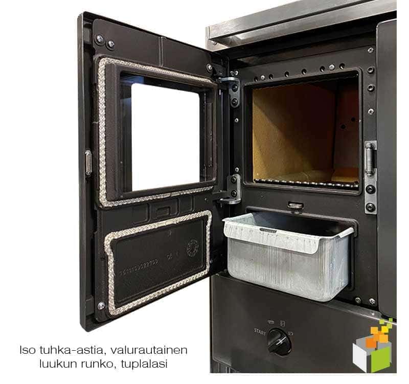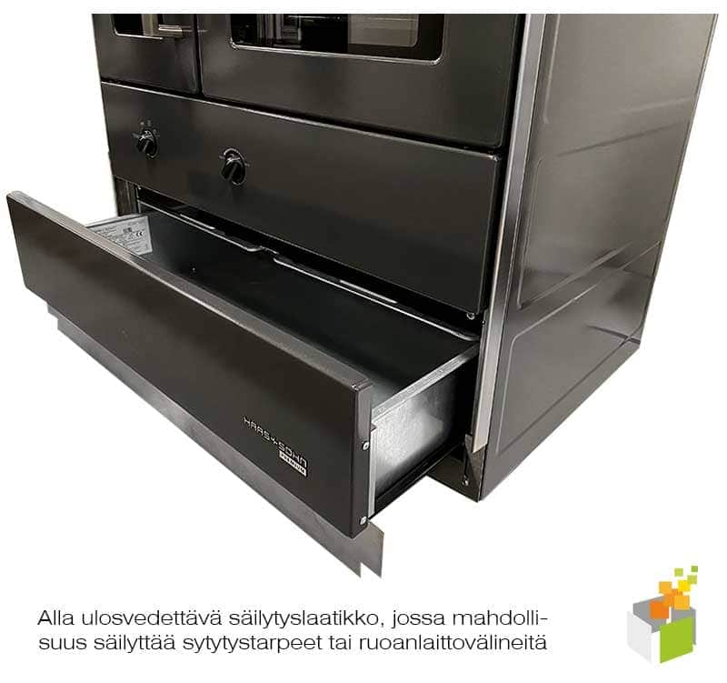75.5 SF on huippulaadukas ja monipuolinen lämmitys- ja ruoanlaittolaite. Tuotteesta on saatavilla vasen sekä oikeakätiset versiot. Oikeankätisessä versiossa hormiliitäntä voidaan kytkeä vakiona hellan oikeasta reunasta takaa, oikeasta kyljestä tai päältä, mikäli käytetään teräskantta. Vasenkätisessä versiossa hormiliitokset vasemmalla puolella. Saatavilla myös keraaminen kansi, josta ei ole liitäntämahdollisuutta ylöspäin. Tulipesän luukussa sekä uunissa on tuplalasi, joka vähentää ruoanlaittajan jalkoihin kohdistuvaa säteilylämpöä. Lasiluukun runko valurautaa. Kuoret emaloitua terästä. Helppokäyttöinen sytytysavustin (suoraveto) ja ilmansäätöventtiili. Tulipesässä nykyaikainen polttotekniikka, jossa ilmaa ohjataan tulipesään arinoiden alapuolelta, tulipesän taustalta ja sivuilta (jälkipoltto), sekä ns. ilmahuuhtelu lasiluukulle lasin ylä- ja alareunasta, joka auttaa pitämään lasiluukun puhtaana mahdollisimman pitkään. Tulipesän kyljet ovat paksua keraamikiveä, joka nostaa polton lämpötilaa ja parantaa hyötysuhdetta. Valurautaiset arinat, joissa ravisteluvipu. Ison 6,5 l kokoinen tuhka-astian ansiosta tuhkia ei tarvitse tyhjätä joka päivä! Tuhka-astia on piilotettu tulipesän luukun taakse. Säädettävät seisontajalat, ja etusokkelin peitelevy. Tehokkaassa paistouunissa paistat ruoat kuten normaalissa sähköuunissa. Paistolämpötila nousee tarvittaessa yli 250 °C lämpötilaan. Pintakuoret emaloitua terästä, väri antrasiitti ja valkoinen.