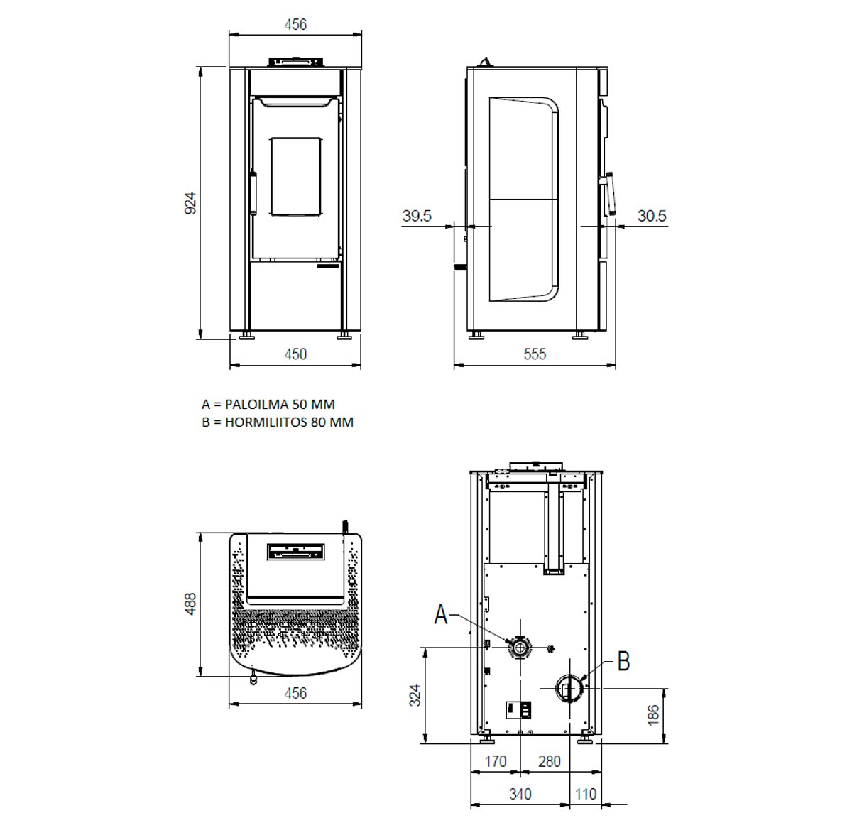Paloilmaputken koko: 50 mm takaa