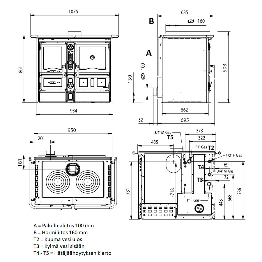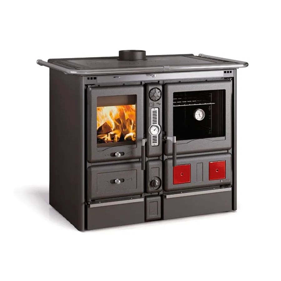 Tehokkaampi malli Termorosa vesikiertohellasta. Valurautaiset luukut ja keittotaso. 15 kW veteen antaa pienen puukattilan verran tehoa, ja teho riittää isompiinkin lämmitysaloihin! Iso 60 litrainen uuni. Automaattinen korvausilmansäädin jolla voit hienosäätää haluttua lämpötilaa tulipesässä. Tulipesässä kolmannen sukupolven huipputehokas jälkipoltto. Keittotasossa kaksi nopeasti kuumenevaa keittolevyä. Hormiliitäntä keskeltä, valittavissa päältä tai takaa. Jäähdytetyt sivukuoret. Nostoarinat (saatavilla lisävarusteena) kesä asennossa lämmität keittotasolla nopeasti ruokaa lämmittämättä huonetta. Vakiona hellassa punaiset keraamiset koristelaatat, mukana toimitetaan myös vaihdettavat mustat laatat.